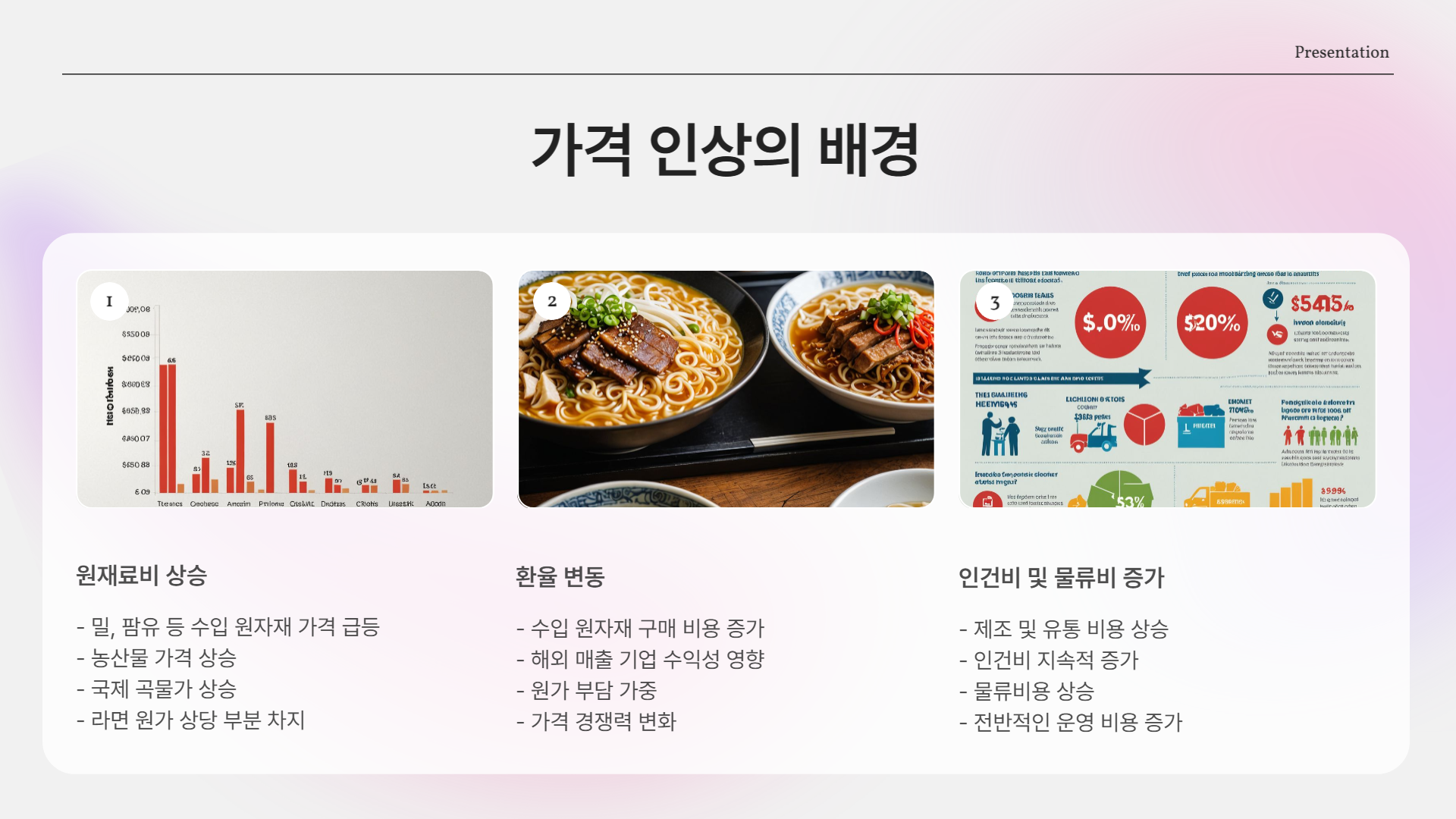 원재료 수입가 상승, 국제 곡물가, 물류비, 환율, 인건비 등이 복합적으로 영향을 주었습니다.