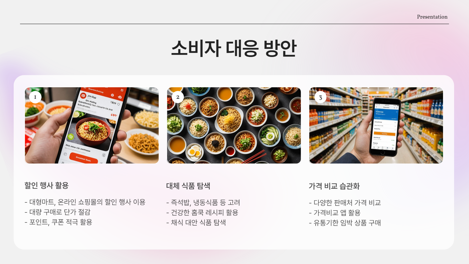- 대체 식품 탐색: 국수, 냉동식품 등 대체 가능성 높은 식품 활용